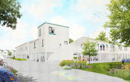 Naast private tuinen komt er een grote, gemeenschappelijke tuin die rechtstreeks aansluit op de Groene 62. Deze open groene ruimte vormt niet alleen een rustpunt voor bewoners, maar ook een natuurlijke verbinding tussen het stadscentrum en de achterliggende woonwijk.