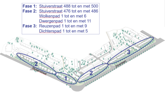De woningen worden gefaseerd afgebroken en in de plaats komt nieuwbouw, een combinatie van woningen en appartementen. We starten pas met fase 2 als fase 1 klaar is, en met fase 3 als fase 2 klaar is.